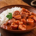 Laissez-vous guider par les effluves irrésistibles qui s’élèvent de l’assiette : l’odeur franche de l’ail saisi rencontre la douceur sucrée des oignons, lentement rissolés jusqu’à devenir fondants comme du beurre. Au cœur de ce mélange, les rondelles de saucisses libèrent leur caractère fumé et puissant, enrobant le palais d’une chaleur rustique. Le riz, d’un blanc immaculé et cuit à la vapeur, attend patiemment de s’imprégner de ces sucs savoureux pour une bouchée à l’équilibre parfait entre force et tendresse.
